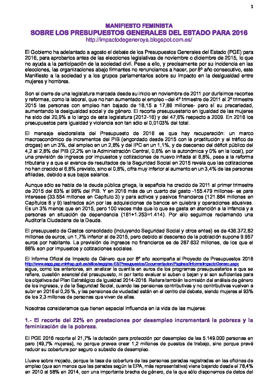 Estos PGE reflejan un modelo económico basado en actividades productivas poco intensivas en tecnología, depredadoras del medio ambiente, que no atiende las necesidades sociales y que agrava los problemas de desigualdad social, particularmente la desigualdad entre hombres y mujeres; todo ello con desastrosas consecuencias para la economía y para la sociedad.